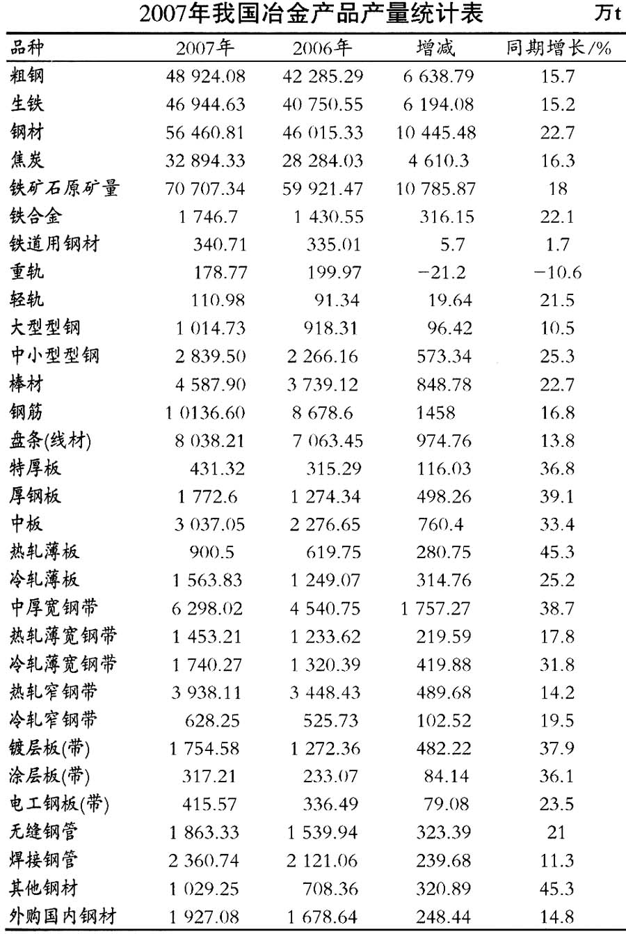 钢铁工业是国民经济基础产业部门之一,是国家经济建没、国防建设的必不可少的基础原材料,从航空航天、人造卫星、国防尖端领域,到汽车、造船、发电、纺织、化工、石油、仪表、医疗卫生等行业都离不开钢材。我国钢铁工业历经50多年的发展,特别是改革开放20年以来,有了巨大进步,取得了举世瞩目的成就:钢产量增加速度加快,技术水平明显提高,产品结构不断调整,成为名副其实的钢铁大国。1996年我国钢产量首次超过1亿t大关,跃居世界第一位,此后我国钢产量一直保持世界排名第一的位置。2007年实现粗钢钢产量4.89亿t,钢材产量达到5.65亿t。