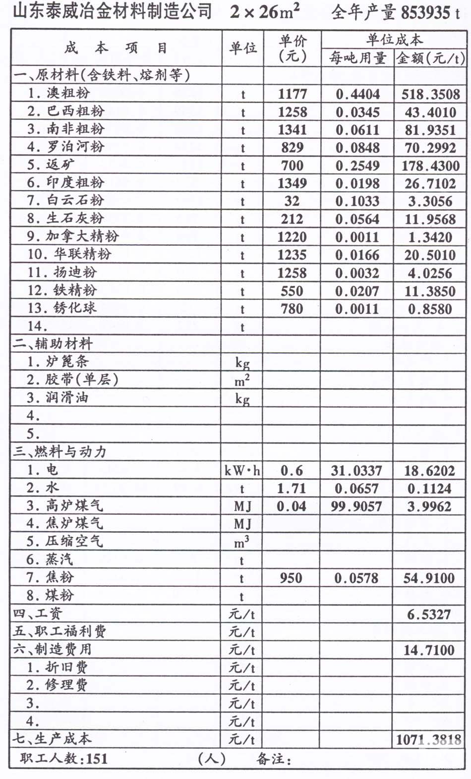 炼铁成本计算[山东泰威冶金材料制造公司]
