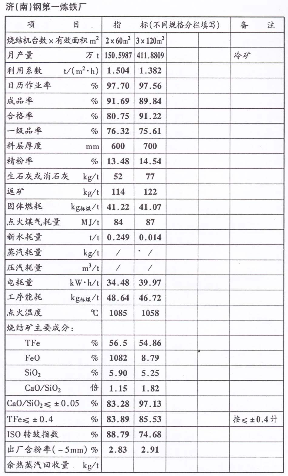 2010年7月部分250~499平米烧结机累计技术经济指标