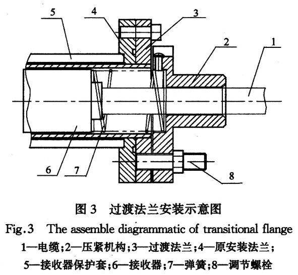 将过渡法兰用螺栓固定在结晶器原安装接收器的法兰上,过渡法兰上安装可拆的调节螺栓,将接收器放进保护套内,通过调节螺栓上的锁母将接收器固定板压紧,接收器就被弹簧压紧到保护套内,弹簧具有吸振缓冲功能,使接收器不会受结晶器振动影响。安装示意图如图3所示。