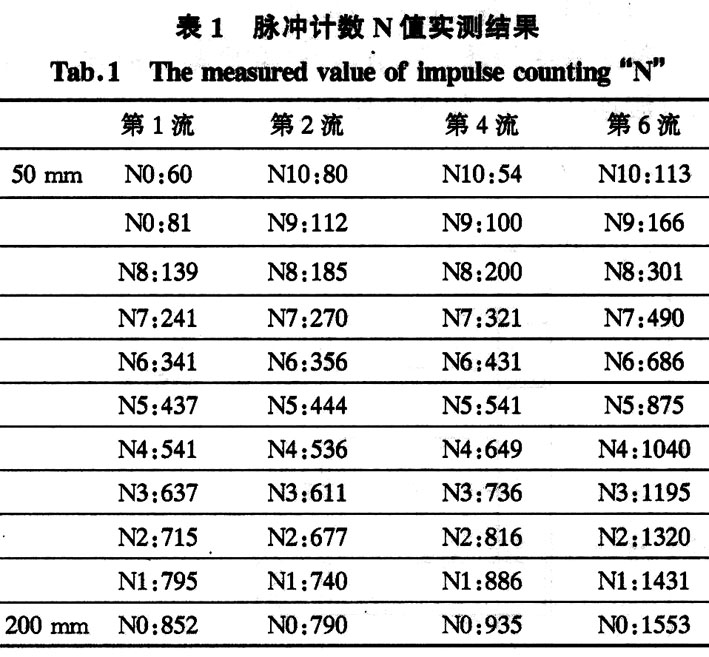 由此可见,脉冲计数N是关系到能否进行正常液面控制的关键数据。我们对其进行测定,N值的大小反映放射源信号的强弱,4号机结晶器刻度范围是在铜管口下50 mm到200 mm。50 mm那一点仪表的N值记为N10点的刻度数据,200 mm那一点仪表的N值记为N0点的数据,每调整15,mill都记下仪表的N值作为刻度数据,根据N与液面H之间的线性关系,N值变化愈明显,实现的液面控制将愈灵敏。正常生产中的液面控制在铜管口下(80