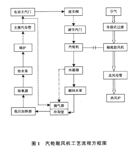 汽轮鼓风机系统是将具有一定压力和温度的过热蒸汽通过汽轮机做功,汽轮机旋转带动鼓风机,将净化空气以一定的压力和流量输送到用户,空气的流量和压力既可以通过调节动静叶片之间的角度来实现,也可以通过改变进汽量从而改变转速来实现;电动鼓风机和汽动鼓风机原理大致相同,只是原动机不同而已,汽动鼓风机原动机是汽轮机,而电动鼓风机是电动机。相对于汽动鼓风机,电动鼓风机启动时间短、维护方便。汽轮鼓风机的工艺流程如图1。