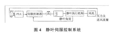 轴流压缩机对风量和风压的调节是通过调整压缩机静叶角度的变化来实现的。静叶角度的调节回路由内环控制和外环控制形成的串级回路组成,外环部分由PLC通过PID调节控制器完成;内环部分包括静叶位置变送器、静叶伺服控制器和静叶伺服机构。静叶伺服控系统如图4,通过调节静叶角度的变化,按工艺状态的要求增降压缩机的出力,在工艺对风量要求不大时,压缩机的负荷也随之降低,没有因放空运行造成的能源浪费,节能作用十分明显。静叶伺服控制器通过比较来自位置变送器和PLC的控制信号,发出伺服指令信号驱动静叶伺服机构,推动静叶承缸按指定方向动作,从而完成对压力和风量的稳定控制。在外环控制部分,操作人员可选择定压力或定流量,手动或自动控制,按照工艺需要对目标值进行设定,由PID调节器完成对压力或流量的自动调节。