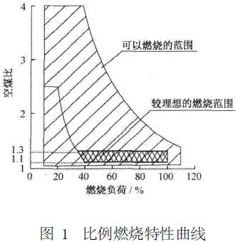 图1为比例燃烧控制的燃烧特性曲线。从图中可以看出, 当燃烧负荷低于40%时, 为了满足稳定燃烧,空气过剩系数增大,意味着燃烧气体中空气量增多,这样过剩空气带走废气中的热量,降低了燃烧效率。