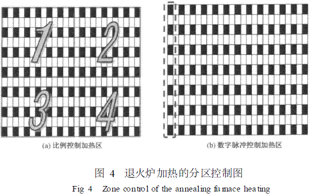 冷轧带钢连续退火炉的烧嘴一般有300个左右,均匀地分布在炉膛内,炉温控制就是根据实际负荷大小对这些烧嘴的燃烧状态进行控制。一般把这些烧嘴按照一定排列分成为若干加热区,这些加热区内又有一定数量的烧嘴。