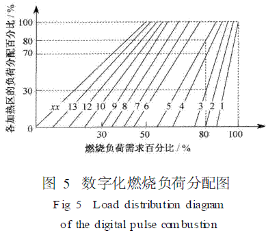 传统的比例控制加热炉的烧嘴一般分4~8个区,这些区是物理上的分区,即每个区的燃料比例控制总阀是一个。当该控制总阀调节时,整个区的燃料供给情况均发生变化,即该区的烧嘴燃烧负荷发生变化。也就是说传统的比例燃烧控制系统的炉温是根据加热负荷的变化来控制每个区的燃器比例调节阀,从而使每个区的燃烧负荷发生变化。对于数字化燃烧控制系统,加热炉内的烧嘴也是分成若干区,但是这些区不是受物理分区限制,而是按照列或者行随意组合,是一种模拟的分区。图4为两种控制系统的加热分区示意图。图5为数字化燃烧系统负荷分配的基本思想。