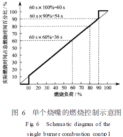 图6为单个烧嘴的燃烧控制示意图。假设该烧嘴的一个燃烧周期为60 s, 60 s内燃气阀门全开燃烧可以满负荷燃烧。当燃烧负荷为80%的情况下,对应的燃烧时间为总时间60 s的80% ,即80%负荷情况下的燃烧时间为48 s。