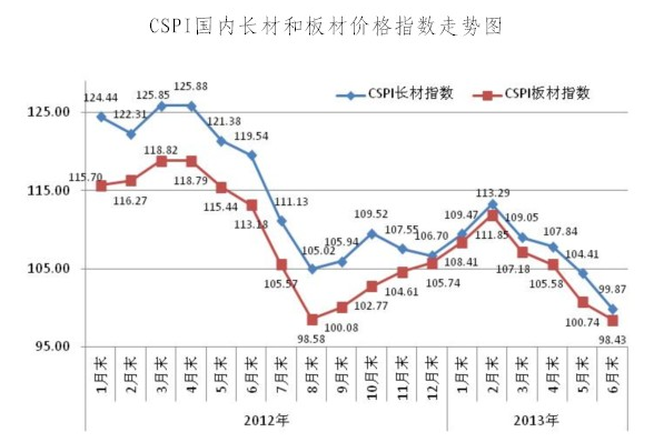6月末,CSPI长材指数为99.87点,环比下降4.54点,降幅为4.35%,较上月加大1.17个百分点;板材指数为98.43点,环比下降2.31点,降幅为2.29%,较上月收窄2.29个百分点,比长材降幅低2.06个百分点;与去年同期相比,长材指数下降19.67点,降幅为16.45%;板材指数下降14.75点,降幅为13.03%。(见下图、下表)