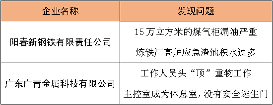 明查暗访组还总结了轧钢厂存在蒸汽和燃气管网的气体介质无流向指示,加热炉周围天然气泄漏报警仪配置不够等问题,并指出炼钢厂作业区域没有配置粉尘和有毒有害气体监控报警设备,以及厂区内部道路设置交通标识线及警示标志不足。明查暗访组将全部问题反馈给高新区应急管理局,让阳江市应急管理局进行督查。企业方表示尽快整改。