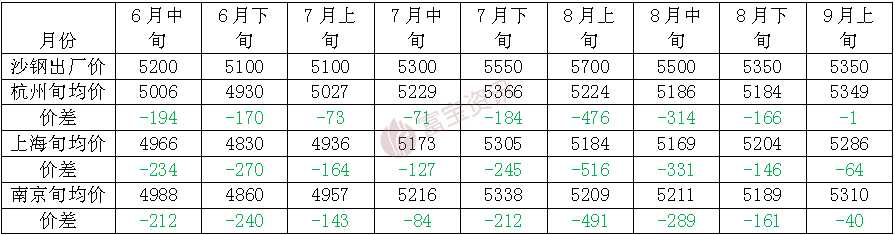 9月上旬建筑钢材市场价格正式开启拉涨模式,在能耗双控的支撑下,期螺全面上攻,江苏地区各大钢厂加严限产力度,钢价供弱需强,截止目前钢价高位坚挺运行,加上近期表观需求以及库存均有所下降,截至9月10日为止,江浙沪区域内三大主导城市:上海地区沙钢大螺纹厂提基价报5420元/吨;杭州地区沙钢大螺纹库提基价报5520元/吨;旬末江浙沪主导城市沙钢均价大约5286-5349元/吨左右,沙钢上旬出厂指导价格为5350元/吨,具体价格情况如下图所示。