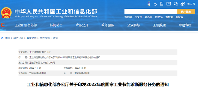 近日,工业和信息化部网站发布了《工业和信息化部办公厅关于印发2022年度国家工业节能诊断服务任务的通知》(以下简称《通知》)。