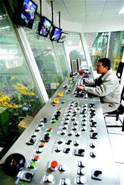 2日,工作人员正在总控室操作设备,刚刚建成的目前世界规模最大、工艺装备一流的中厚壁热轧钢管生产线开始运转,整个生产流水线进入试运行阶段。湖北新冶钢特种钢管生产线是于2007年开工建设的,主要设备由德国设计制造,年生产能力30万吨。