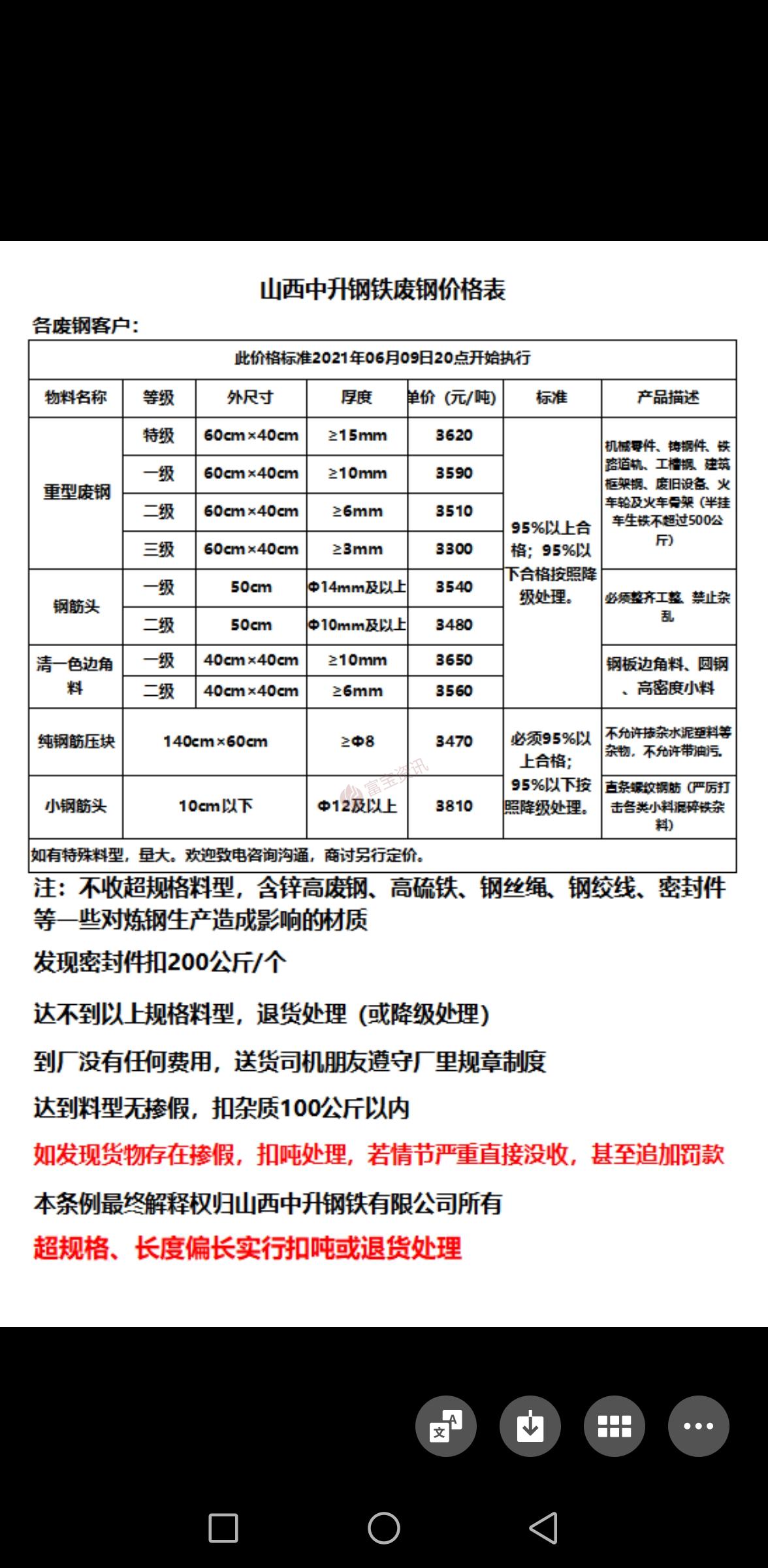 9日20点临汾中升废钢个跌30,特级15厚以上3620,一级料3590,二级料6厚以上3510,钢筋头一级3540,清一色边角料10厚以上3650,纯钢筋压块3470,小钢筋头3810,不含税