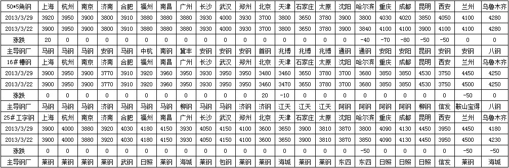 由于市场成交不见起色,加上临近月底商家面临回笼资金压力,个别地区出现降价抛货现象,华北地区表现较为明显,但同时受低库存支撑,华东和华中地区价格较为坚挺,一方面是等待主导钢厂价格政策,另一方面商家面临成本倒挂因素。库存方面,2013年03月29日上海市场型材仓库进行同口径调查统计,工角槽库存8.22万吨,较上周环比下降0.08万吨。