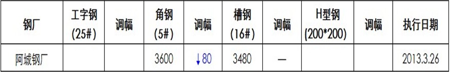 本周调整型材出厂价格的钢厂并不多,其中阿钢对角钢出厂价格下调80元/吨,对槽钢和工字钢出厂价格不变;马钢公布了4月份型材基价表,其角槽钢基价与3月中旬结算价格相等,详见下表。