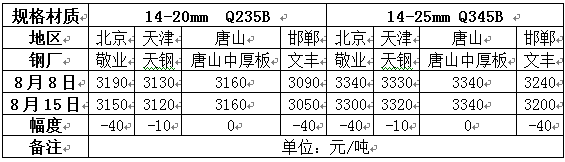 概述:受普阳、文丰、敬业锁价下跌影响,本周京津冀中板价格均有不同幅度下跌,价格底部继续下移,具体情况如下:一、价格方面二、钢厂方面本周(8月9日—8月15日),京津冀地区中厚板生产企…
