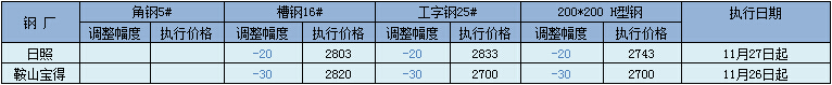 钢厂方面:26日鞍山宝得对型钢在21日价格基础上统一下调30元/吨;11月27日日照钢铁在上期价格基础上对大小线型钢价格统一下调20元/吨。