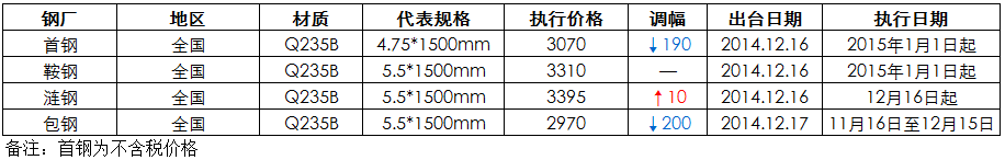 本周首钢对1月份热轧板卷出厂价格下调190元/吨;11月份包钢热轧板卷结算价格下调200元/吨;涟钢自12月16日起上调热轧板卷出厂价格10元/吨。另外鞍钢1月份热轧板卷出厂价格持平。考虑到后期含硼钢材出口退税政策的不明朗,目前许多钢厂已经暂停热轧板卷出口安排,后期现货市场供应压力或增大。