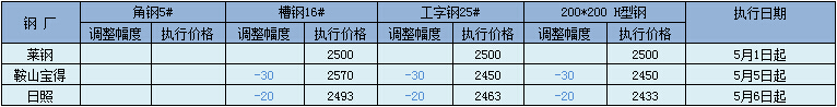 钢厂方面:日照对型钢品种下调20元/吨,莱钢对大线型钢品种出厂价格下调30元/吨,鞍山宝得对型钢品种下调30元/吨。