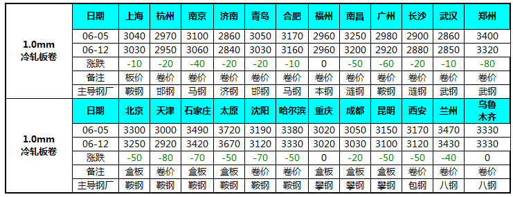 价格方面,截至发稿,现0.5mm冷轧全国平均价为3352元/吨,环比6月5日价格下跌18元/吨。1.0mm冷轧全国平均价为3122元/吨,环比6月5日价格下降37元/吨。华东地区本周受天气因素影响,市场价格在短暂企稳后继续下探,考虑到鞍钢资源抵达市场仍需时日,预计下周上海市场价格波动幅度较小,江苏市场冷轧或有下跌。华北地区本周内价格补跌幅度较大,目前鞍钢1.0mm冷卷主流报价2920元/吨,由于价格持续偏高,贸易商表示经常亏损出货,是以价格下行也在情理之中。其实,从不少钢厂成本来看,国营大厂已经亏损生产,不少民营钢厂也是出于亏损边缘,但是由于需求不足,预计冷轧市场继续下行为主。