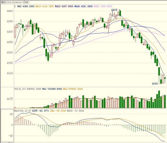 技术分析:RB1210合约收于接近于十字星的阴线,但仍受均线压制,均线系统延续空头下跌排列,MACD指标绿柱缩短,跌势尚未结束。继续观察4050元/吨一线的支撑。