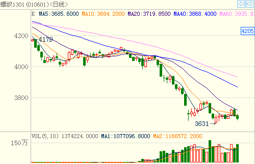 近期,螺纹钢1301合约期价始终在3630—3780元/吨区间振荡整理。在股指和商品市场整体弱势的影响下,沪钢连续两日出现了较大幅度的回调,均线也再度发散向下,期价明显受制于5日均线。