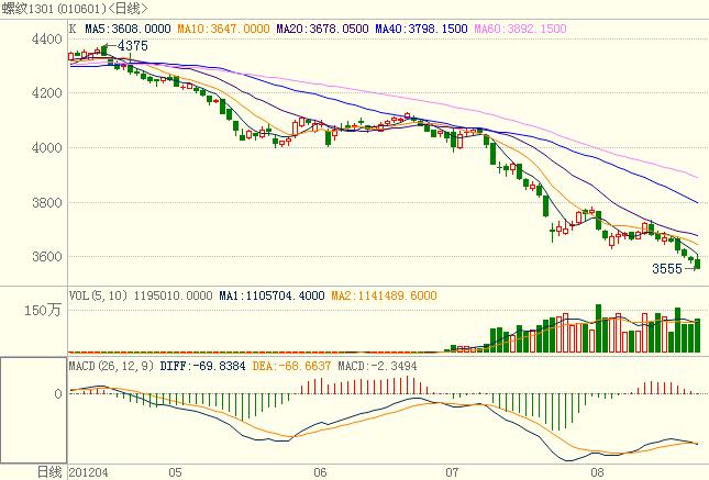 昨日螺纹1301较前结算价平开,价格小幅上扬后围绕3600弱势整理,后空头主动增仓放量,价格大幅跳水,午后价格震荡走低,终收3557跌33点,成交与持仓均上升。