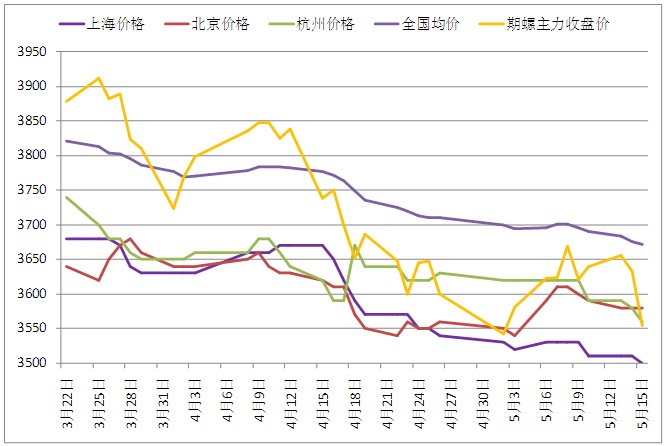我们分别选取上海、北京、杭州三地的三级螺现货价格与全国的均价及期螺主力收盘价作比较分析。从图中我们可以看出,近期主要现货市场价格不断走弱;期螺主力合约大幅下行,跌破3600平台支撑。综合来看,资讯分析师方德认为,现货弱势,需求清淡,对期货影响利空。