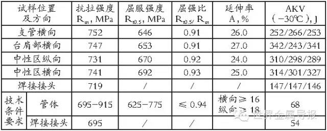 采用试制的钢板,在热处理试验研究的基础上,进行了厚壁等径三通管件的试制。经焊接成直筒坯料,在经起包、压扁、切口、再到拔制等工序,制成等径三通管件,随后对管件进行调质处理以获得所需的强度韧性配合,淬火温度为950℃,保温1小时20分钟后再采用循环水淬火,回火温度为590℃,保温时间为150min。