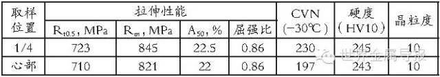 采用上述的成分设计及生产工艺,在兴澄特钢4300mm厚板生产线进行了36-53mm厚X90/X100管件用特厚钢板的试制。并对钢板的显微组织、力学性能进行了分析,观察试制钢板53mm厚钢板不同厚度位置的显微组织照片,经轧制+加速冷却后得到的钢板组织均为针状铁素体+粒状贝氏体。同时钢板表面晶粒细小,钢板心部与板厚1/4处相比晶粒大小及组织变化不明显,采用ASTM E112标准对晶粒度进行检测,晶粒度均达到10级以上。表2是钢板心部及板厚1/4处等不同厚度处性能检测,检验结果表明经TMCP工艺轧制后,虽然钢板厚度达到53mm厚,但钢板沿厚度方向性能变化不明显,从而保证了厚度方向性能相对稳定性,尤其值得一提的是钢板心部-30℃夏比冲击功接近200J,表明钢板在高强度情况下还具有很高的冲击韧性。