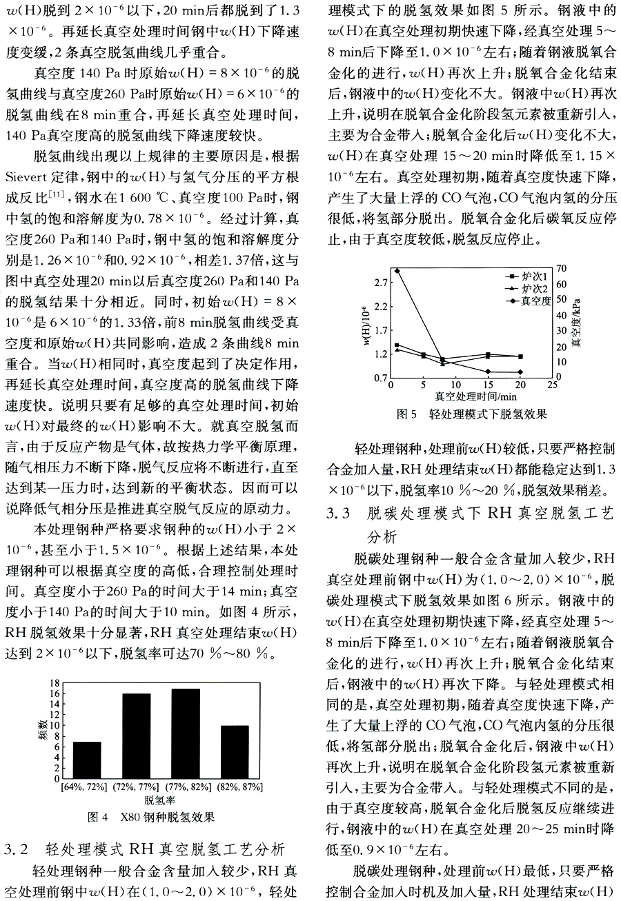 对300tRH真空处理前钢中氢含量的影响因素进行分析,得出转炉原辅料加入量的影响很小,湿度有一定的影响,合金加入量影响最大。对300tRH真空3种模式下的脱氢工艺进行分析研究,结果表明: