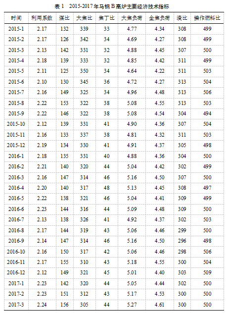 通过多方面的管理创新和技术变革,马钢B高炉逐渐走出困境并实现1000天以上的长周期稳定顺行,经过两年多时间的探索和研究,在“平台+漏斗”布料模式上,高炉在维持当前燃料比的条件下,利用系数、煤比、焦比均突破自身长期的瓶颈,取得了一定的进步,得到持续改善,在O/C不断上提的条件下,高炉对焦炭的需求逐步减少,缓解了马钢长期焦炭供给侧不平衡的局面,目前B高炉仅靠马钢自产新区统焦及老区统焦即可维持正常生产,焦炭品种和质量的稳定性得到保证,为提煤比、降低焦比又创造了条件,形成良性循环。具体经济技术指标见表1。