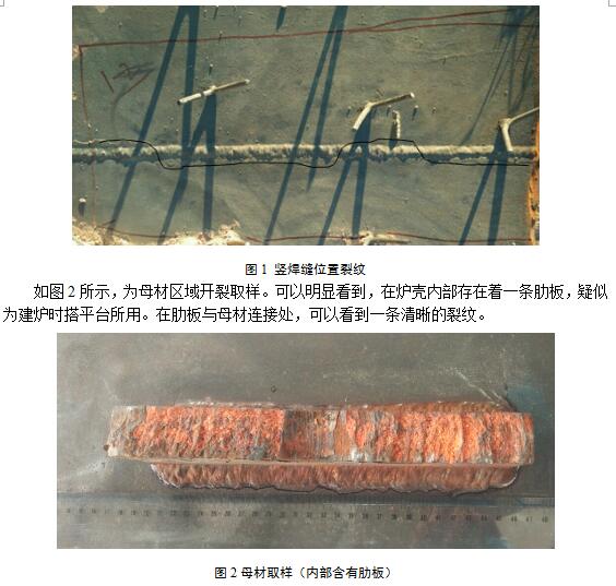 如图1所示,为热风炉炉壳包含竖焊缝位置区域取样。可以看到的是,裂纹沿着焊道分布,且存在着贯穿焊道的现象。