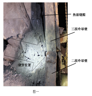烧穿发生在12#和13#风口方向的炉缸第二层冷却壁上部,烧出的孔洞高度约20cm,宽度约50cm。经检查二层冷却壁只烧损一块,附近的冷却水管以及环管全部受损。具体烧损部位如图一所示。
