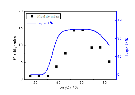 在试验的基础上本文对Fe2O3-CaO二元系相图进行了基础研究。读出了每个试验点所对应的液相线温度和在1300℃时每个试验点的液相量。每个试验点的流动性指数示于图2.1 、2.2 。从试验结果可以得出,随着Fe2O3含量的增加,Fe2O3-CaO二元铁酸钙粘结相液相流动性呈现先增加后降低的趋势。且当Fe2O3含量在78%时达到最大值6.3。而且Fe2O3-CaO二元铁酸钙粘结相液相流动性与液相线温度成较好的反比关系。Fe2O3-CaO二元铁酸钙粘结相液相流动性与该温度下液相量成较好的正比关系。根据以上结果,可以做出假设,烧结矿液相的流动性与液相线温度成反比关系,与固定温度下的液相量成正比关系。此假设将由后续试验进行验证。