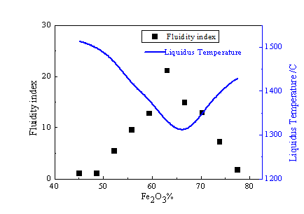 图2.1 Fe2O3-CaO二元铁酸钙粘结相液相流动性与液相线温度的关系