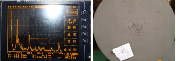 图1轴承钢连铸坯4#的UT波形(左)与其低倍组织(右)