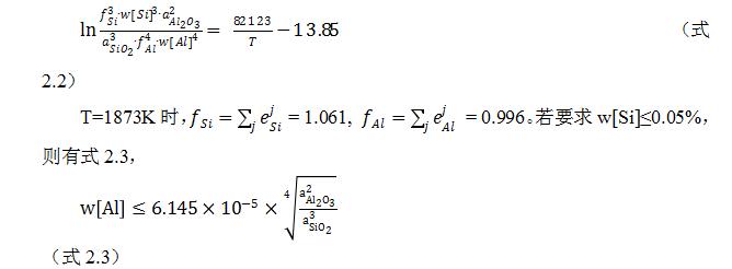 4[Al] + 3SiO2(l) = 2Al2O3(s) + 3[Si] ΔGθ= -682770 + 115.14T (式2.1)