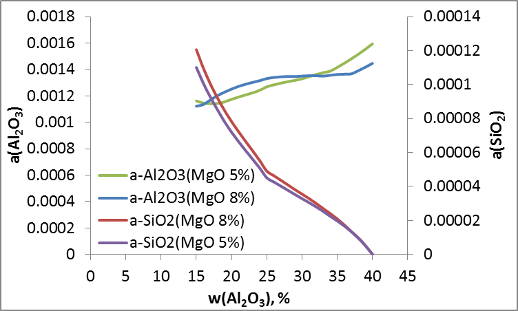 Fig. 4 Trend Curve of SiO2 & Al2O3 activity with Al2O3 content in slag
