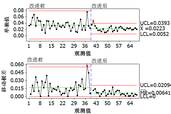 如图11,采取措施前,LF炉精炼结束硅含量采样39炉,均值0.0345%,最大值0.075%,出格炉数4炉,统计不合格率10.3%,过程能力指数Cpk值[42]0.34,预测长期不合格率16.2%;采取措施后,LF炉精炼结束硅含量采样29炉,均值0.0222%,最大值0.046%,全部合格,过程能力指数Cpk值1.35,达到受控状态的要求1.33,预测长期不合格率0.2%。