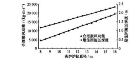 图2 不同炉容大小高炉合理鼓风动能和最佳回旋区深度