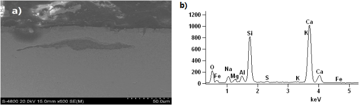 为进一步分析钢板表层线缺陷成因,沿线缺陷垂直方向进行切割、取样,同时利用扫描电镜对其形貌进行观察。图2为线缺陷断面及能谱分析,其中图2a)为线缺陷横断面形貌,图2b)为能谱分析。利用扫描电镜对其形貌进行观察发现,该处深度约距离表面几十微米,宽度约为200um,无明显的向下延伸的趋势,对其内物质进行能谱分析,发现主要含有O、Fe、Na、Mg、Al、Si、K、Ca、Mn元素,其中的Na、K为保护渣特征元素,这说明该缺陷可能是由于结晶器流场不合理等原因造成保护渣。这种夹杂物属于塑性较差的硅酸盐、硅铝酸盐夹杂物,在轧制过程中,夹杂物与基体的变形不一样,塑性差的复合类夹杂在轧制过程中几乎不变形,呈颗粒状挤压基体,该地方成为裂纹生产的源地,并在后续的轧制过程中,随着轧件厚度的不断减薄,卷入保护渣周边的裂纹也会逐渐扩展,造成产品质量问题。