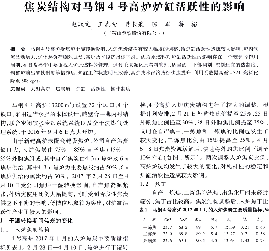 焦炭结构对马钢 4 号高炉炉缸活跃性的影响