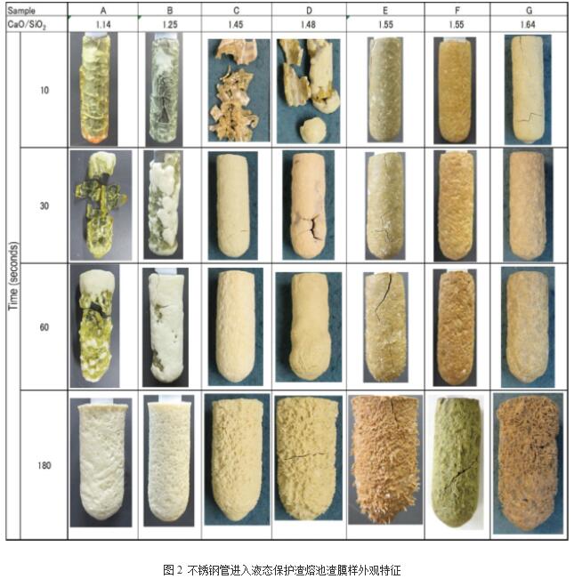 不锈钢管浸入的时间分别为10秒、30秒、60秒和180秒,每次浸入达到规定的时间后,将不锈钢管从渣池中拔出,收集不锈钢管表面形成的渣膜进行外观和截面观察,测量结晶层的厚度。此外,使用光学显微镜下观察抛光后的结晶层结构,并用x射线衍射(XRD)对晶体进行了分析。