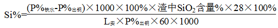 入炉金属料硅含量=装入量×铁水所占比例×铁水硅含量%+装入量×生铁块所占比例×生铁块硅含量%+装入量×废钢所占比例×废钢硅含量%