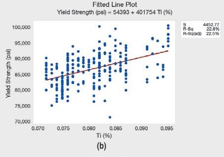 由于化学成分和热机轧制参数的变化,材料的力学性能会发生很大的变化。对Gr80钢种数据进行逐步回归分析,确定影响性能的因素。卷曲温度、Ti含量百分比、带钢厚度、连铸拉速和含铌量的百分比排在前五位。图7为(a)卷曲温度、(b) Ti%、(c)带钢厚度对屈服强度的影响,它们对拉伸强度的影响是相似的,因此没有给出。三阶模型最能反映卷取温度对屈服强度的影响。拟合曲线显示最佳卷曲温度在620℃到630℃之间,以最大限度地提高屈服强度。屈服强度与钛含量呈正相关,与带钢厚度呈负相关。屈服强度与Ti%和产品厚度的关系可以用线性模型来描述。