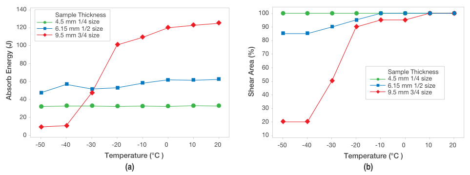 利用吸收能量和剪切面积数据确定了转变温度。对于每种带钢厚度,基于吸收能量和剪切面积百分比的转变温度基本相同。DBTT随着产品厚度的增加而增大。对于4.5 mm厚的产品,在-50°C低冲时没有发生转变,而9.5 mm厚的产品在-20°C到-30°C之间的低冲发生了转变。
