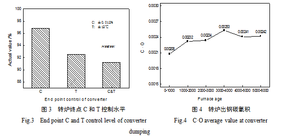 (2)无人工干预自动化炼钢,自动炼钢比例达到99%以上,超低碳钢直接出钢率92%以上。转炉终点C、T命中率以及全炉役C·O积水平分别如图3、图4所示。