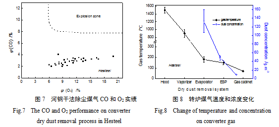 采用气液双向雾化喷嘴、优化荒煤气管路长度和蒸发冷却器结构,有效控制冷却器板结和除尘器极线极板的腐蚀。河钢转炉干法除尘的应用效果如图8、表2所示。