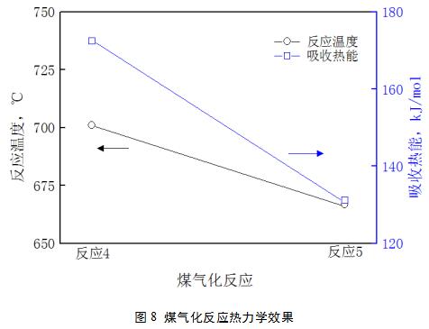 从图8中可以看出,煤气化反应4与反应5对于热能的回收从热力学角度来看各有利弊。从反应的最低温度上看反应4不如反应5效果好,由于反应4中C与CO2的煤气化反应需要的最低温度要比反应5中C与H2O(g)的煤气化反应要高,而在反应过程中炉渣温度会逐渐降低,从而会使反应受到限制,不利于对炉渣余热的吸收,但从反应吸收热能的能力角度来看反应4要比反应5效果好。